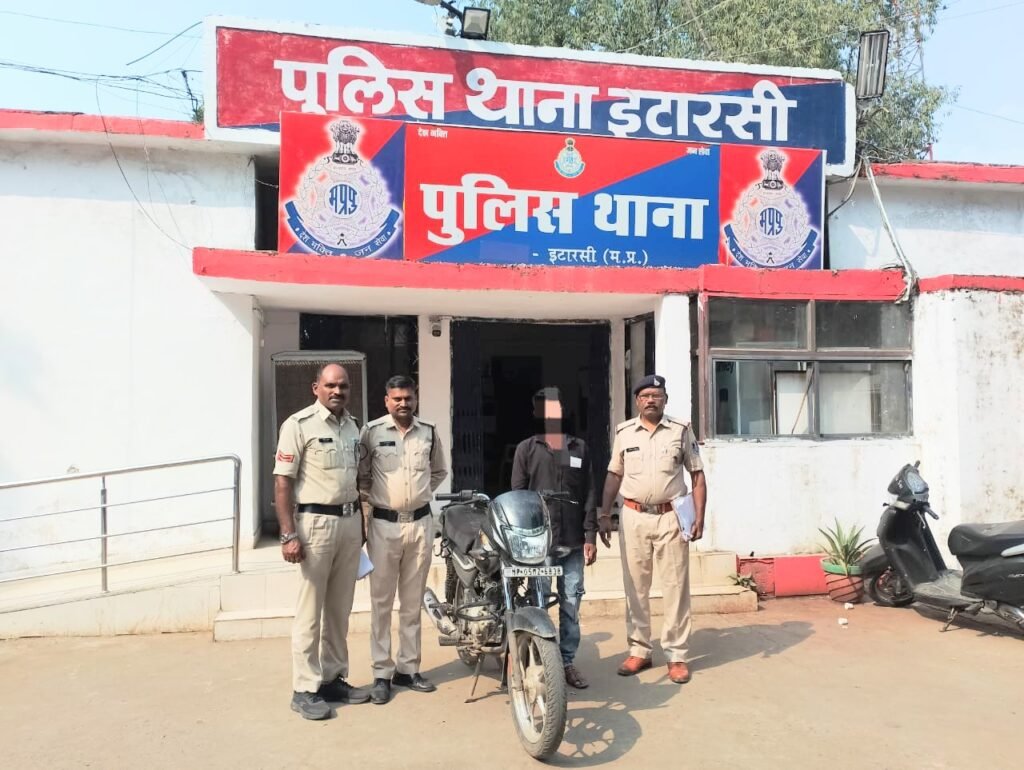 इटारसी। दिनांक 23/10/25 को फरियादी चंदन मालवीया निवासी इटारसी ने थाना इटारसी उपस्थित होकर रिपोर्ट करते हुए बताया कि आवेदक पंजाब नेशनल बैंक इटारसी ब्रांच में कार्यरत है। दिनांक 23/10/25 को रोज कि तरह सुबह 09 बजे बैंक पहुंचकर गाडी पार्किंग में लगाकर गाडी से चाबी निकालना भूल गया और बैंक में चला गया। दिन में 14:30 बजे आकर देखा तो गाडी पार्किंग में नहीं दिखी एवं आस पास ढूंढने पर भी नहीं मिली जो कि किसी अज्ञात व्यक्ति द्वारा चोरी कर ले गई । जिस पर अज्ञात व्यक्ति के खिलाफ थाना इटारसी में अप. क्र. 863/2025 धारा 303(2) बीएनएस का पंजीबद्ध कर विवेचना में लिया गया। चुंकि घटना का वीडियो सोशल मीडिया पर प्रसारित हो रहा था पुलिस अधीक्षक नर्मदापुरम द्वारा थाना प्रभारी इटारसी को त्वरित कार्यवाही करने हेतु निर्देशित किया गया। थाना प्रभारी इटारसी द्वारा हमराह बल के टीम गठित कर आरोपी की पतारसी हेतु छानबीन शुरू की गई। खोजबीन के दौरान मुखबिर से प्राप्त सूचना के आधार पर पुलिस टीम द्वारा उक्त वीडियो में दिख रहे व्यक्ति की पहचान करते हुए आरोपी रोशन पिता रामकुमार ठोके उम्र 30 साल निवासी 12 बंगला पुरानी इटारसी को थाने लाकर सख्ती से पूछताछ करने पर आरोपी द्वारा उक्त मोटर साइकल चोरी करना स्वीकार किया गया एवं आरोपी के घर 12 बंगला रेलवे क्वाटर के सामने पुरानी इटारसी से एक काले रंग की प्लेटीना मोटर सायकल क्रमांक MP05MZ6838 कीमत 55,000 रुपये की जप्त की गई। आरोपी एक आदतन अपराधी है जिसके विरुद्ध थाना इटारसी में 01. अप. क्र. 593/2014 धारा 186,353,294,506,34 भादवि 02. अप. क्र. 194/2016 धारा 294,323,324, 506,34 भादवि 03. अप. क्र. 365/2024 धारा 294,323,506,34 भादवि के कुल 03 अपराध पंजीबद्ध है । उक्त कार्यवाही में थाना प्रभारी इटारसी गौरव बुंदेला, सउनि रामराव उइके, आर. 539 शाकिर खान, आर. 729 सालकराम उइके एवं आर. चालक 841 राजेश पवार की सक्रिय भूमिका रही ।