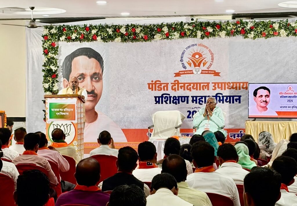 नर्मदापुरम । भारतीय जनता पार्टी के प्रदेश अध्यक्ष एवं विधायक हेमंत खण्डेलवाल ने शनिवार को पं. दीनदयाल उपाध्याय प्रशिक्षण महाभियान-2026 के अंतर्गत नर्मदापुरम के रामानंद गार्डन में आयोजित मंडल प्रशिक्षण वर्ग को संबोधित किया। उन्होंने कहा कि भाजपा ने बदलते समय के साथ कार्यपद्धति में बदलाव किया है, लेकिन अपनी विचारधारा से कभी समझौता नहीं किया।