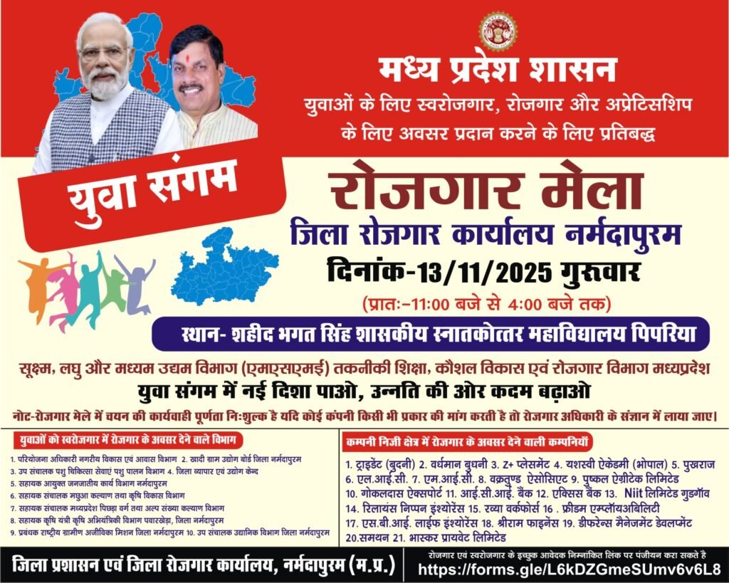 नर्मदापुरम। मध्यप्रदेश शासन के सूक्ष्म, लघु एवं मध्यम उद्यम विभाग (एमएसएमई), तकनीकी शिक्षा, कौशल विकास एवं रोजगार विभाग द्वारा युवाओं को स्व-रोजगार, रोजगार और अप्रेंटिसशिप के अवसर प्रदान करने के उद्देश्य से “युवा संगम – रोजगार मेला” का आयोजन किया जा रहा है।