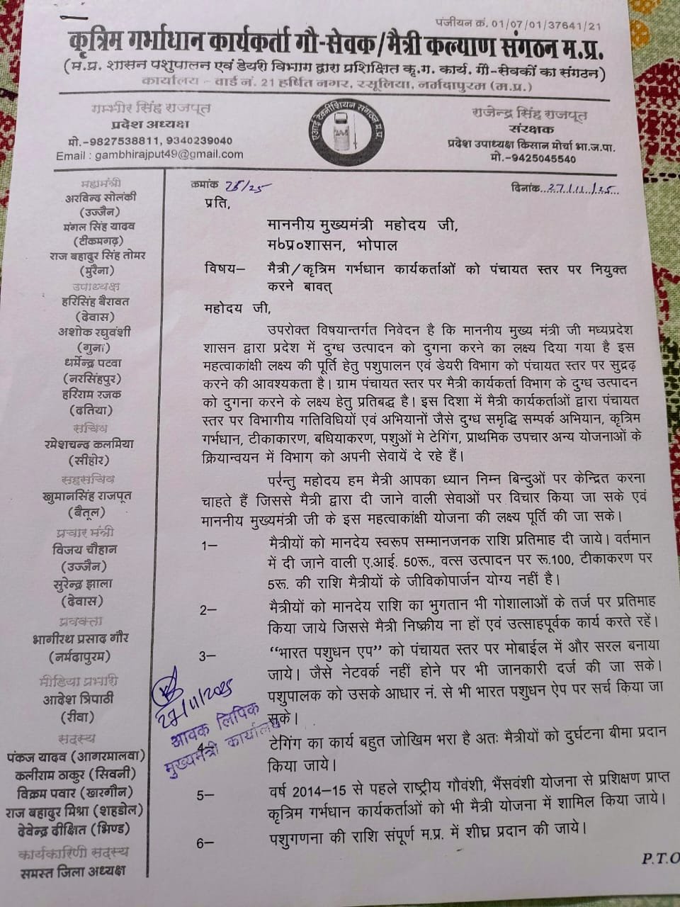 नर्मदापुरम। मध्य प्रदेश के पशुपालन विभाग के प्रशिक्षित कृत्रिम गर्भाधान कार्यकर्ता (मैत्री) संगठन ने ज्ञापन सौंपकर दुग्ध समृद्धि संपर्क अभियान के द्वितीय चरण में पांच रूपए की दर से काम करने से इनकार कर दिया है। संगठन के प्रदेश अध्यक्ष गंभीर सिंह राजपूत ने बताया कि प्रदेश में दुग्ध उत्पादन को दुगना करने के उद्देश्य से पशुपालन एवं डेयरी विभाग द्वारा दुग्ध समृद्धि संपर्क अभियान तीन चरणों में संचालित किया जा रहा है। अभियान का प्रथम चरण दो से 9 अक्टूबर तक गांवों में चलाया गया, जिसमें मैत्री कार्यकर्ताओं के द्वारा पंचायत स्तर पर विभागीय गतिविधियों जैसे दुग्ध समृध्दि संपर्क अभियान, कृत्रिम गर्भाधान, टीकाकरण, बधियाकरण, पशुओं में टेगिंग, प्राथमिक उपचार में सेवाएं दीं। लेकिन प्रथम चरण में मैत्री कार्यकर्ताओं को प्रोत्साहन स्वरूप पांच रूपए की राशि प्रत्येक परिवार आश्वासन दिया गया था, जो कि काम एवं समय के हिसाब से बेहद कम है। उन्होंने कहा कि संगठन ने मांग की है कि द्वितीय चरण में बढ़ाकर 25 से 30 रूपए की राशि मैत्री कार्यकर्ताओं को दी जाए, एवं परिवार की संख्या भी एक दिन में 10 की जाए। संगठन ने निर्णय लिया कि यदि मांगे पूरी नहीं हुई तो अभियान में मैत्री कार्यकर्ता सेवाएं नहीं देंगे।