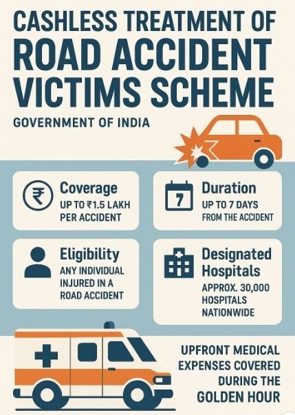 भारत में किसी भी श्रेणी की सड़क पर मोटर वाहन (“सड़क दुर्घटना”) के उपयोग से हुई सड़क दुर्घटना का कोई भी पीड़ित, जिसे आघात या बहु-आघात देखभाल उपचार की आवश्यकता वाली चोटें लगी हैं, इन दिशानिर्देशों के अनुसार योजना के तहत कैशलेश उपचार का हकदार होगा। इस संबंध में, “मोटर वाहन” का वही अर्थ होगा जो मोटर वाहन अधिनियम, 1988 की धारा 2 की उप-धारा (28) के तहत परिभाषित किया गया है।
